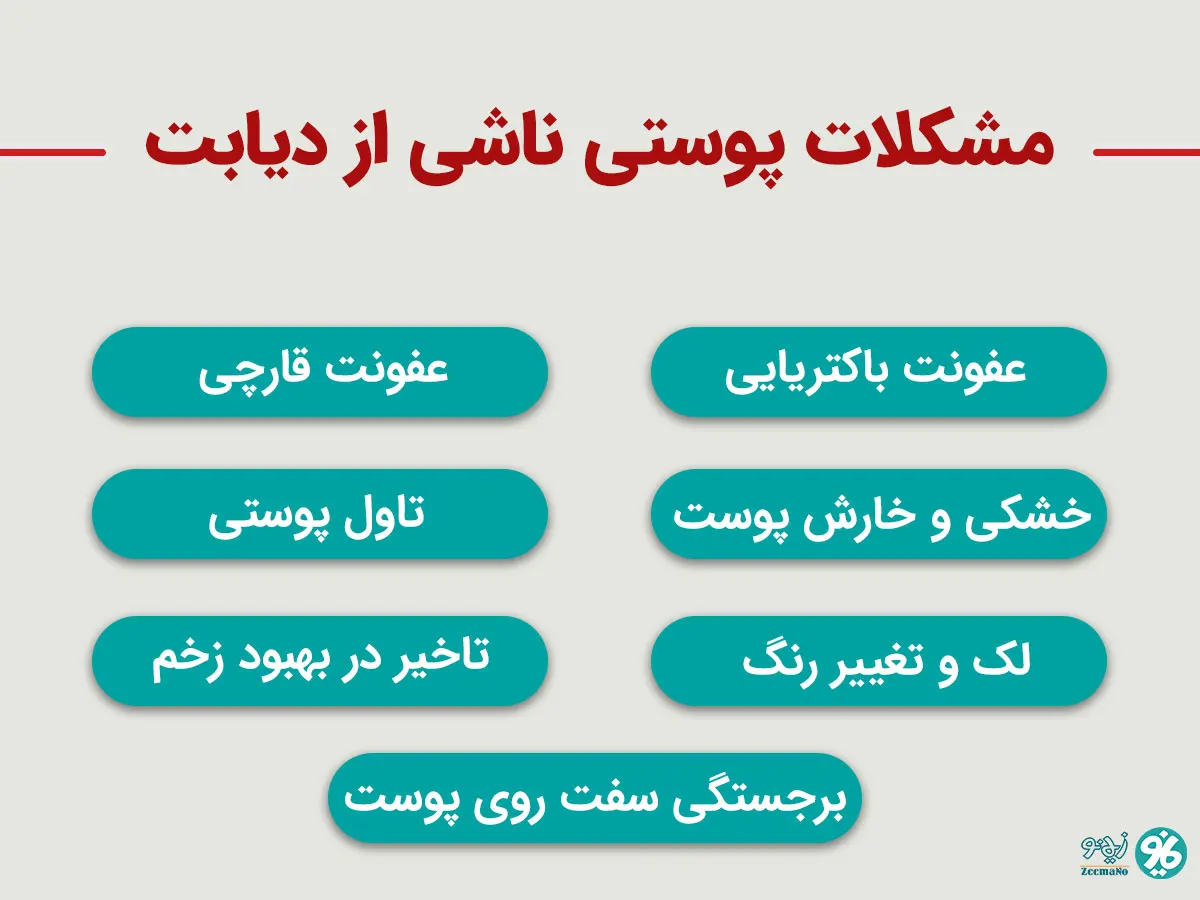 افراد دیابتی، علائم و مشکلات پوستی مختلفی را تجربه میکنند. اکثر بیماران دیابتی با دیابت مزمن و شدید، حداقل یکی از این موارد را تجربه کردهاند: