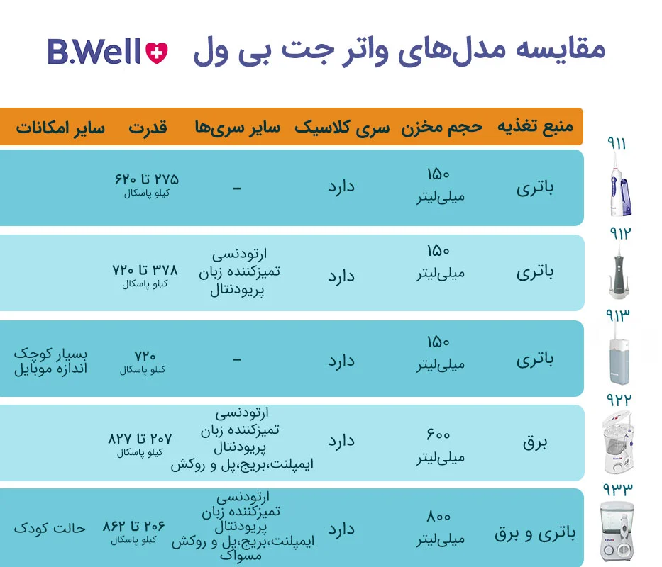 بی ول سوئیس یکی از برندهای مطرح در زمینه تولید محصولات بهداشتی و پزشکی است که با تکنولوژی پیشرفته و کیفیت بالا محصولات خود را عرضه میکند. واتر جت دندان بی ول سوئیس از دستگاههای برجستهای است که به دلیل قدرت تمیزکنندگی بالا، طراحی ارگونومیک و قابلیت تنظیم فشار آب، توجه بسیاری از کاربران را به خود جلب کرده است. این برند بهویژه در بازار اروپا به دلیل استانداردهای کیفیت بالا شناخته شده و به عنوان یکی از بهترین انتخابها برای افرادی که به دنبال یک دستگاه شستشوی دهان با عملکرد عالی هستند، محسوب میشود.